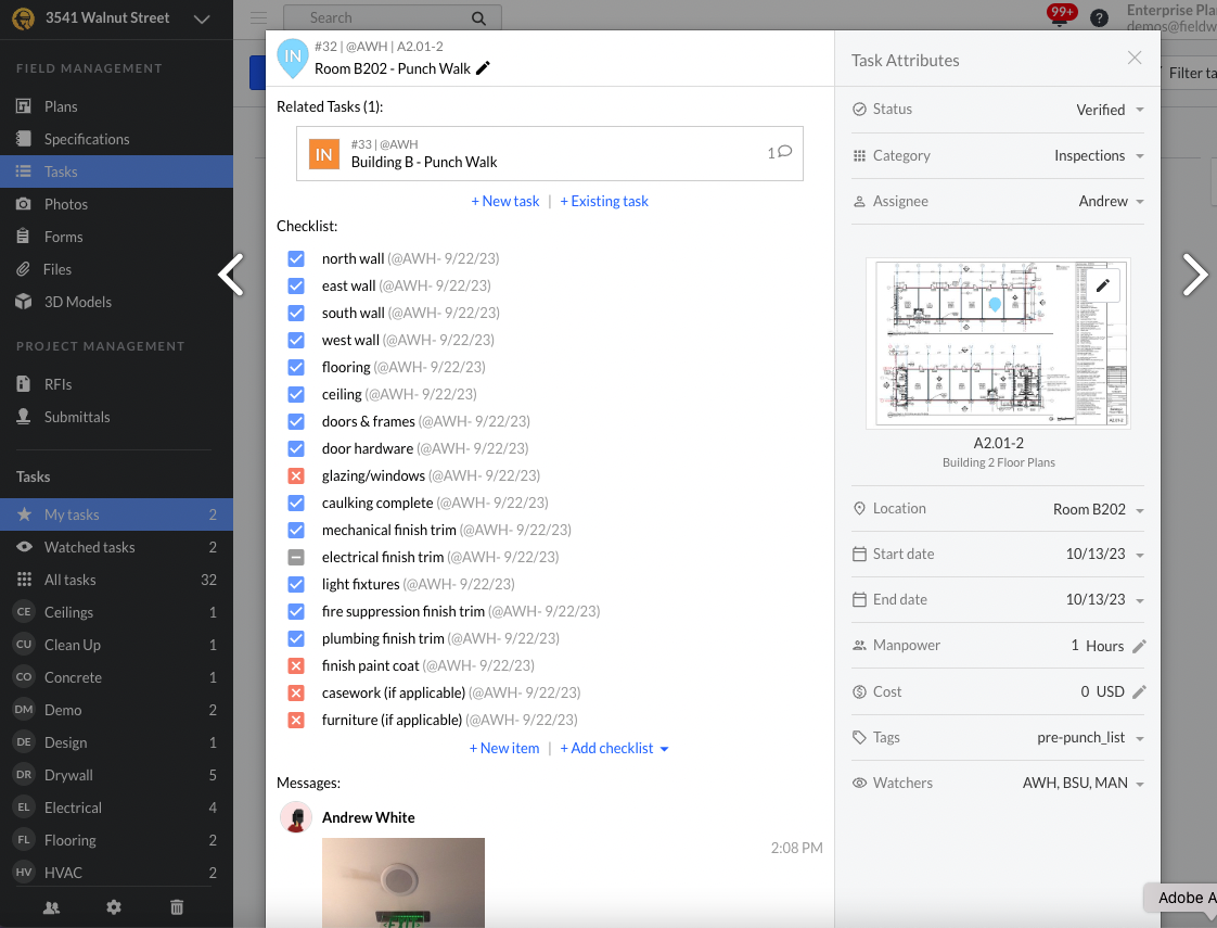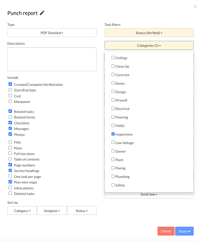 Statuses: You can isolate or sort tasks by category. For example, you may send your subcontractor their “Open items” but an architect “Completed tasks” while you await their verification. The “Verified” report could go to the client.