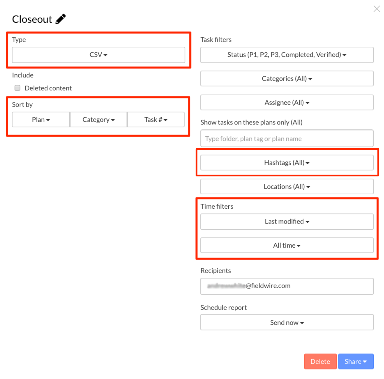 Ideally, a closeout report should include all of the relevant content that you have added throughout the duration of the project. Therefore, it is important that you and your team standardize your usage of Categories, Statuses, Locations, etc on tasks in Fieldwire from day 1 to ensure you'll be able to report on everything that matters to your organization upon completion of the job.