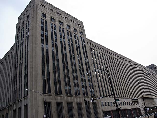 Originally completed in 1921, the original Main Post Office was expanded in 1932 to make room for the bustling mail-order businesses of Montgomery Ward and Sears Roebuck — an expansion that included developing over the railway beneath and leaving a bridged structure through the building for a future highway underpass extension.