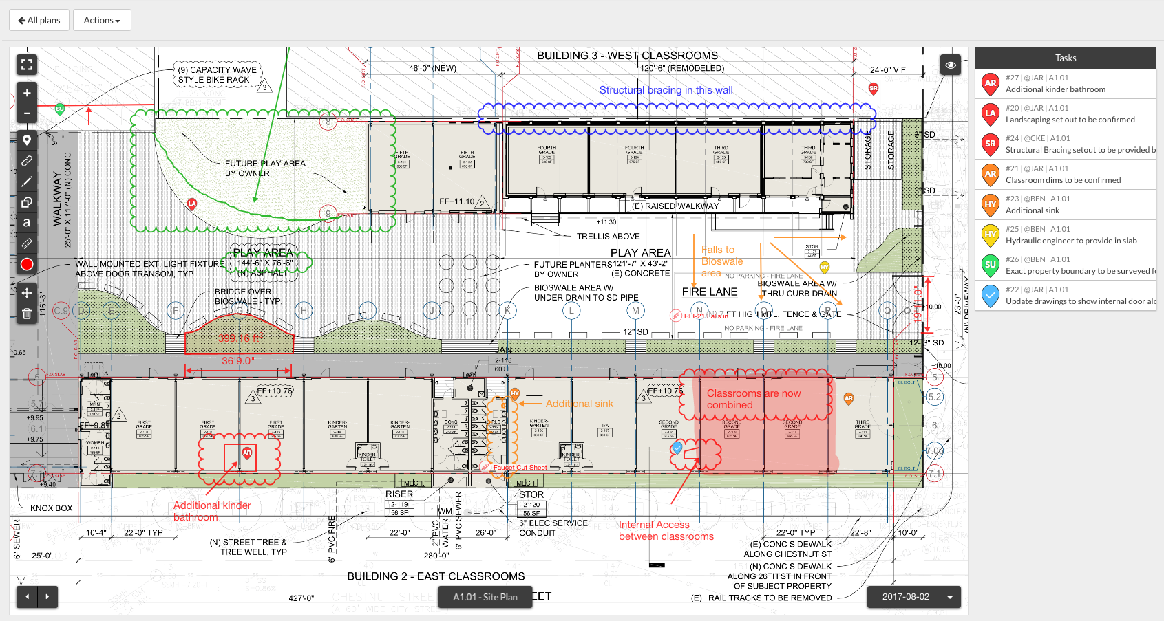 Markups can be added to plans to address any revisions, and measurements can also be included with precise annotations. Sketches, specifications, and other relevant documentation can be pinned to plans and organized in a library of uploaded files. If a task needs to be transferred to another person or discipline as the design progresses, they can be updated with a few clicks in the app so that the appropriate consultant or trade is alerted. Tasks also contain a timestamped history of every update, so you will have a chronological record of everything that has transpired since the task’s creation. Any checklists or comments will be there for easy viewing, and if you need to make an inspection or go on a walkthrough across the site, Fieldwire’s convenient mobile apps will make it a breeze to jot down notes or add site photos as often as needed. The ample suite of tools and features available in Fieldwire make it possible to adapt to any sudden circumstance or phase of construction without breaking your stride.