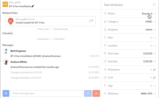Task Status signifies the priority of a task versus other outstanding work items. It helps determine how to allocate and sequence labor onsite. As tasks are finished, your field workers update them to "Complete", and then change the Assignee to (or add as a "Watcher") whoever is best suited to "Verify" that work is done. Task Statuses are leveraged throughout your project and can be used as a filter in Task Reports to capture the progress of groups of tasks within each level of urgency.