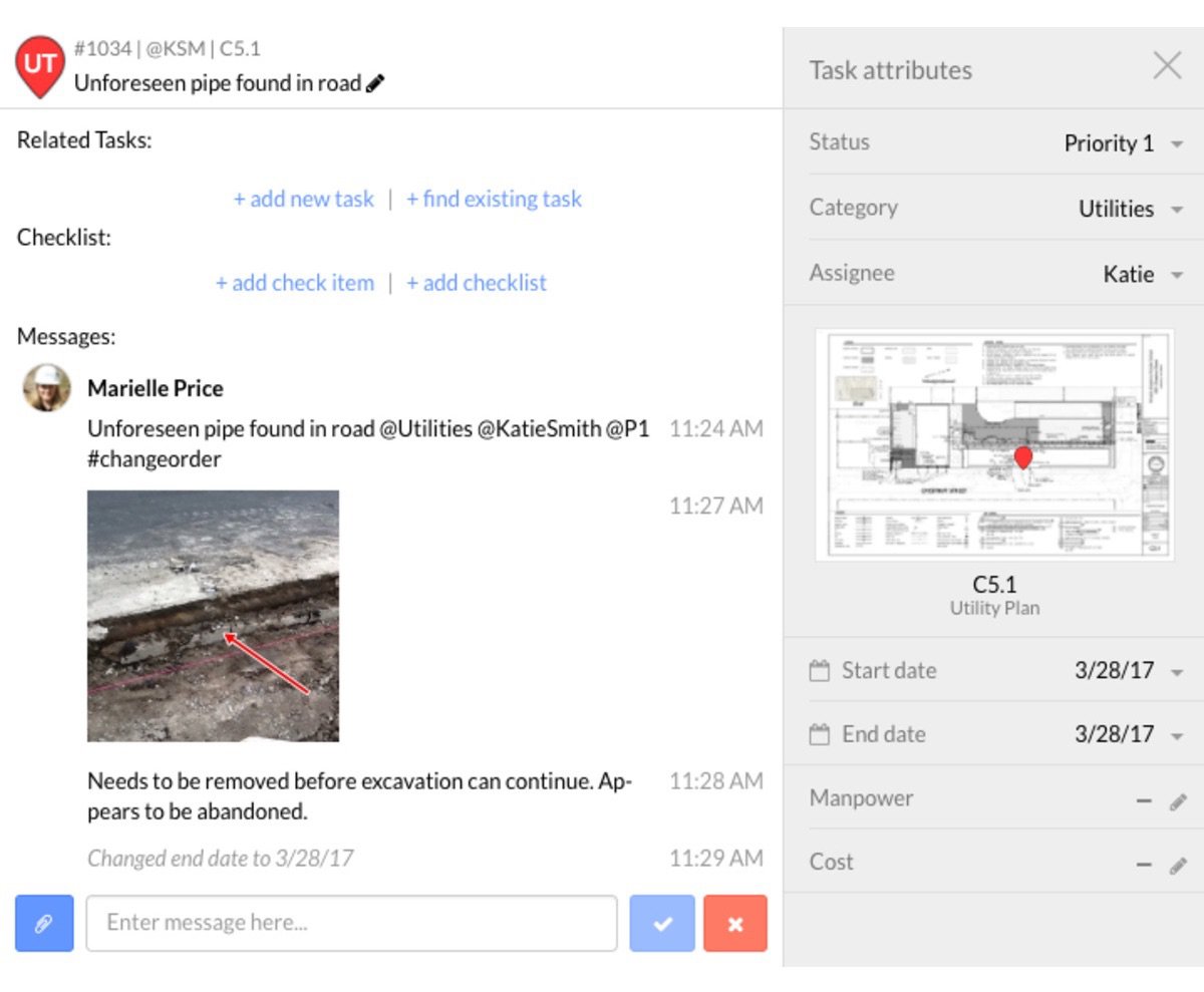When you’re dealing with excavation, you never truly know what you’re going to find. You might come across an abandoned utility pipe, an old foundation, or troublesome soil conditions. Unforeseen circumstances are par for the course in heavy civil construction, and Fieldwire allows you to document any and all sudden issues as soon as they turn up. Add a time-stamped photo or video, leave detailed notes, and assign the issue to the appropriate person. They’ll immediately be notified of the new obstacle and will be able to respond, as well as track any costs and keep you up-to-date on the progress. The entire history of this issue will be saved within the task you create for it in the app.