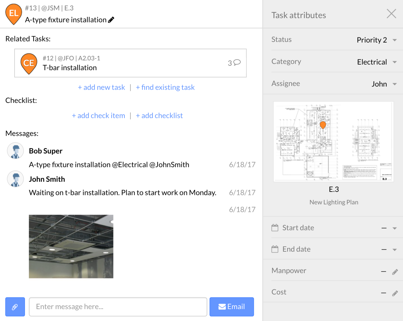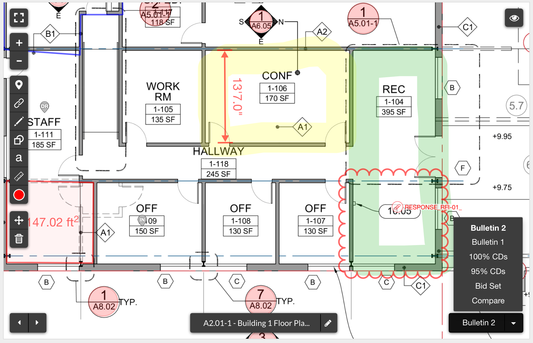 There are a couple of key ways that Fieldwire is so much more than just a simple plan viewer. First, projects are always undergoing changes, and it’s critical to make sure that everyone on your team is always working off of the latest set of plans to avoid rework. Fieldwire’s version control engine makes adding new plan versions effortless. The software will read the new plan number and slip sheet it in front of the older versions, copying over any markups automatically. If you have an RFI or change order that’s going to affect an area, simply attach the file directly to the plan while you’re waiting for a new version to be issued. As soon as the file is posted on the plan, the whole team will be able to see the change.