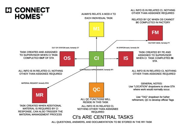 CI tasks are also related to other key tasks. If there’s a change on the line, we add the corrected info before or after the fact. If we get the change captured before a module hits the line, we call it an “IS” for “inside station” task. A collective CI task is then related to the IS — there’s no need to add info to the IS because it’s in the CI — and the IS is assigned to the appropriate person. Or if there’s a change that needs to be after the module has left a station, we call that an “OS” or “outside station” task.