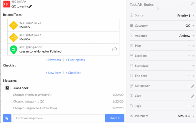 We can attach QC to a task when something’s ready for QC. We relate procurement request tasks and tasks for factory misses to alert the site teams of work that couldn’t be finished in our factory.