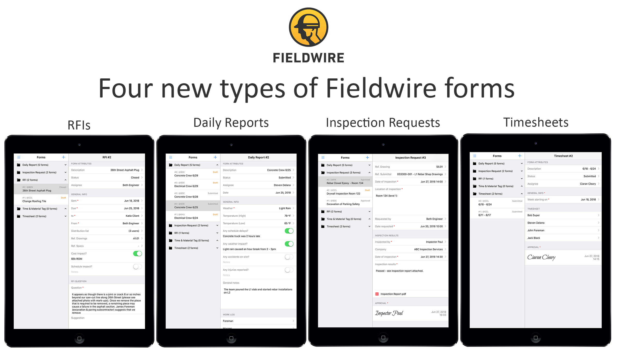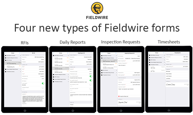 Today, we’re starting with the four types of forms our customers tell us they use the most: Daily Reports, Timesheets, Inspection Requests, and RFIs. What’s included in each form type? (Screenshot showing forms for RFIs, daily reports, inspection requests, and timesheets in Fieldwire app for a large version of the image)