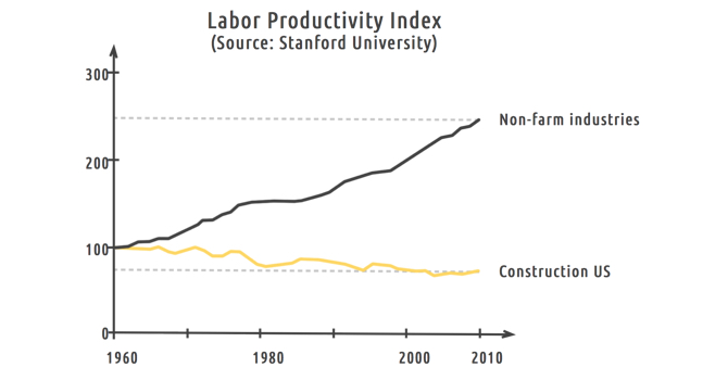 When you look at labor productivity between the 1960s and today, you can see that not much has changed in the construction industry. In the same time period, other large industries like manufacturing or professional services have undergone a major productivity revolution, increasing labor productivity three-to-fivefold. This doesn't mean that construction hasn't progressed from a technological perspective. Architects and design firms have gone completely digital in recent decades. The project manager's office now runs entirely in the cloud with a powerful suite of tailored software for bidding, planning and accounting.