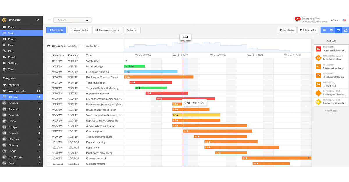An easier way to plan work. In June, we improved our Gantt View of tasks to provide more details and a helpful overview. Now, you’ll see each task’s estimated man-hours in addition to its start and end dates. We’ve also provided an overview of all the work estimated for a specific period of time, rolling up each day’s man-hours into a line graph so you can easily see how many workers you’ll need onsite as well as where to make adjustments.