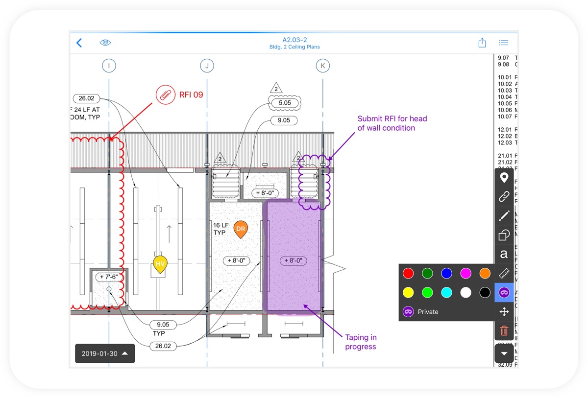 Private markups. Now, any markups you draw in purple will be private to you, meaning no other users on the same project will see them. You can access your private markups from any device (web, iOS, and Android) and filter all of your markups by color.