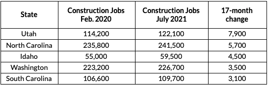 While U.S. construction job growth has been spotty in 2020-2021 due to the pandemic and supply chain issues, certain states have provided solid employment for construction-related workers.