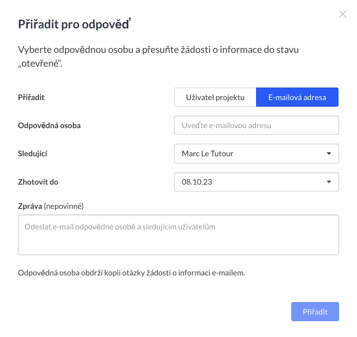 Přiřazování žádostí o informace a technických schválení e-mailovým adresám