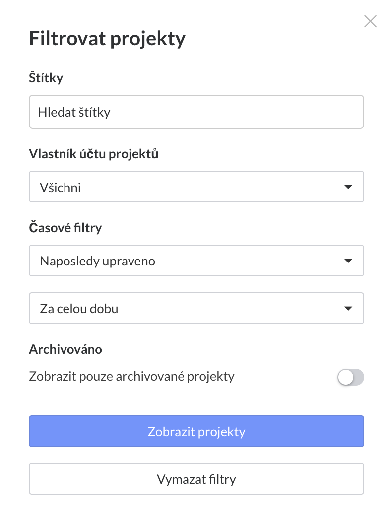 V hlavním panelu projektu na webu nyní uvidíte vedle tlačítka „Seřadit“ také tlačítko „Filtrovat projekty“. Když na něj kliknete, otevře se okno s možnostmi filtrování, například podle štítků projektů nebo vlastníka účtu, abyste mohli rychle a efektivně nalézt projekt, který je zrovna pro vás nejdůležitější. V nabídce filtrů nyní naleznete také možnost zobrazit archivované projekty.
