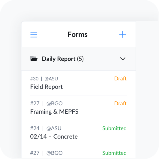 Avec Fieldwire, vous pouvez éviter les risques en réunissant toutes vos formes de construction en un seul endroit. Vous pouvez télécharger vos propres formulaires, personnaliser l'un de nos modèles de formulaires existants ou créer le vôtre à partir de zéro en utilisant notre générateur de formulaires en ligne. Le générateur de formulaires en lignede Fieldwire vous permet de créer des formulaires de construction uniques et modifiables. Vous pouvez ajouter des champs tels que la date et la météo (que nous remplirons automatiquement pour vous), ainsi que diverses sections, notamment des listes, des tableaux et un champ de signature.