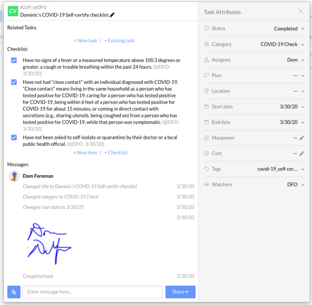 En créant un formulaire ou une liste de contrôle dans une tâche, chaque employé peut s'auto-certifier qu'ils respectent les lignes directrices mises en place pour le poste. Vous pouvez copier et coller depuis ce tableau Excel pour créer votre propre modèle de liste de contrôle pour vos chantiers. Avec ce flux de travail numérique, chaque utilisateur peut s'auto-certifier dans l'application Fieldwire et stocker une trace numérique dans le projet. Cela peut être appliqué à n'importe quelle liste de contrôle ou flux de travail de formulaire, comme les contrôles qualité.