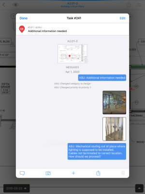 - Lorsque vous recevez votre appel téléphonique, la personne qui travaille à distance récupère la tâche, voit l'emplacement du plan et les photos pertinents, et peut discuter des étapes suivantes.