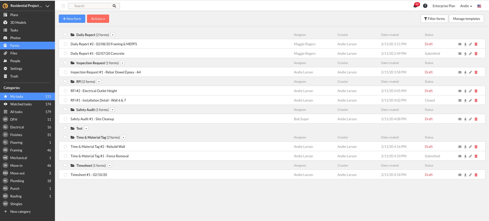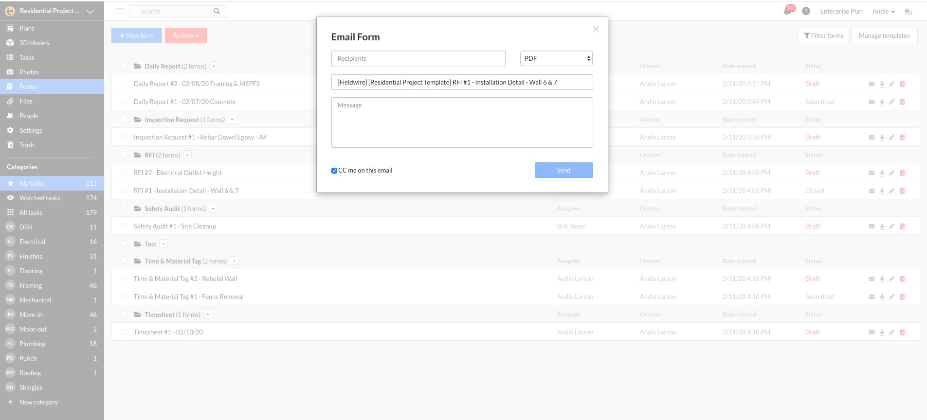 - Dans l’onglet «Formulaires» de Fieldwire (fonctionnalité commerciale), il existe six formulaires prêts à l'emploi. L'une de ces formes est un modèle de demande d'information. Vous avez la possibilité d'utiliser ce modèle tel quel ou d'utiliser le générateur de formulaire personnalisé pour le personnalisé selon vos besoins.