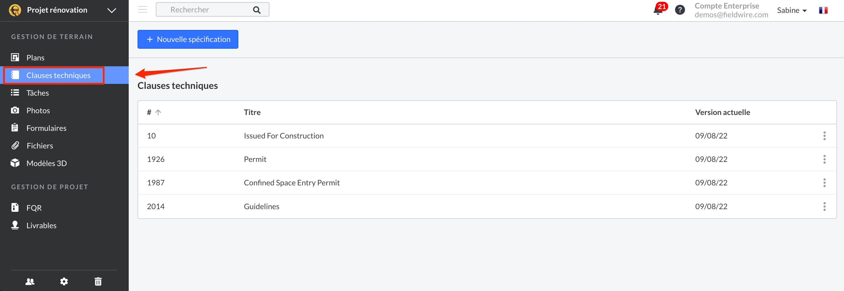 Cet été, nous avons ajouté un nouvel onglet Clauses techniques au sein de chaque projet. En tant qu’administrateur, vous pouvez télécharger et organiser vos clauses techniques dans Fieldwire pour que votre équipe y accède facilement.