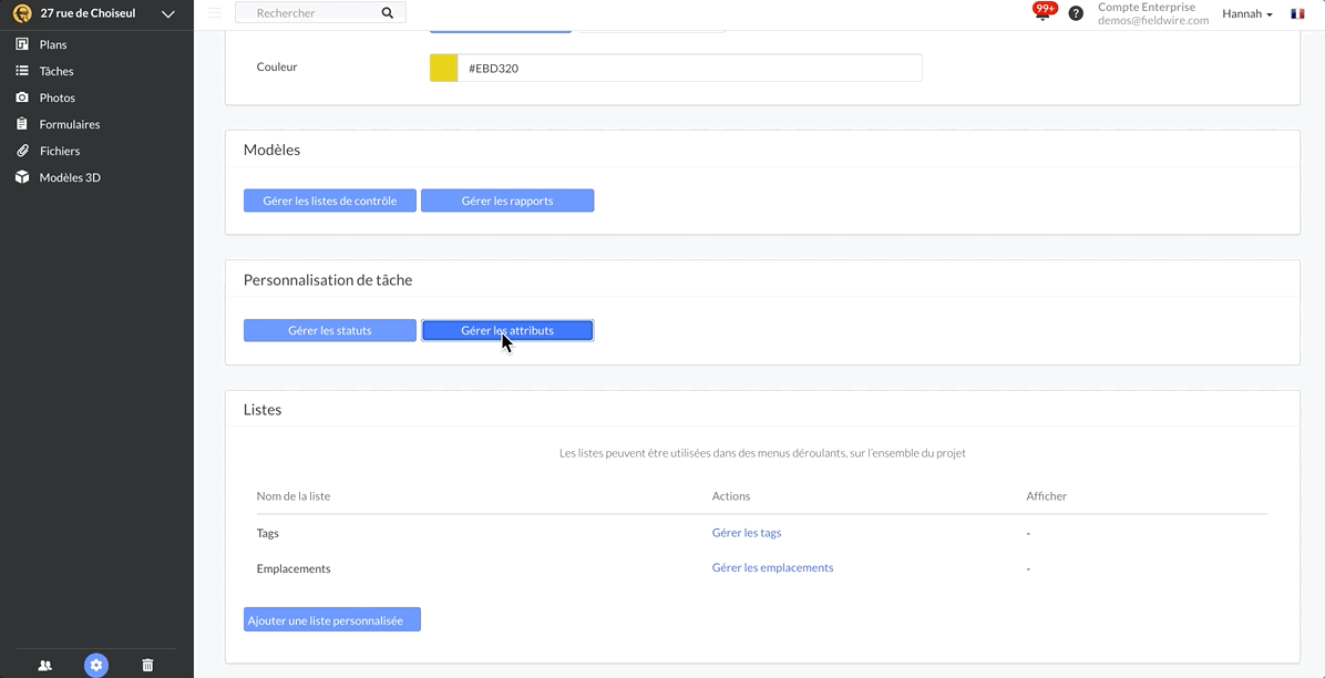 Personnalisez ces attributs dans les Paramètres du projet afin de créer des listes claires et concises de champs pour anticiper, suivre et compléter vos tâches. Cette flexibilité supplémentaire vous permet même de masquer les attributs par défaut pour une adéquation complète aux besoins de votre équipe.