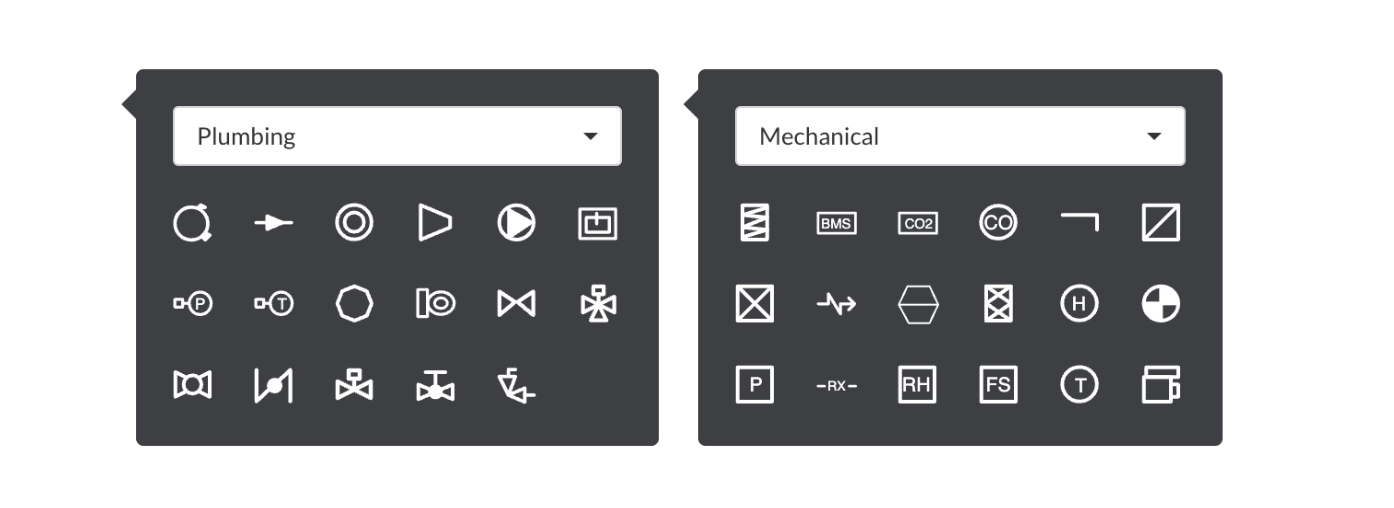 A inizio 2023, abbiamo introdotto la possibilità di aggiungere alle annotazioni simboli relativi a impianti audiovisivi, impiantistica elettrica, sistemi antincendio e di sicurezza. Ora abbiamo aggiunto una simbologia specifica per gli impianti meccanici e idraulici per semplificare i flussi di lavoro delle annotazioni dei subappaltatori specializzati.