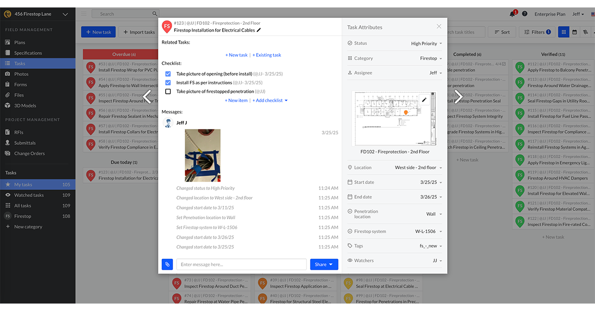 • Firestop installations are logged in Fieldwire tasks with photos, dimensions, and custom categories.