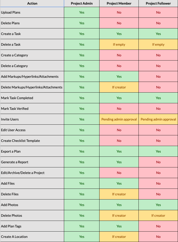 Project Admins can create tasks and categories, upload and rename plans, and assign tasks. They can also add markups, hyperlinks, and attachments to plans, mark tasks as verified, and delete projects. (Creating a new project makes you that project’s Admin by default.)
