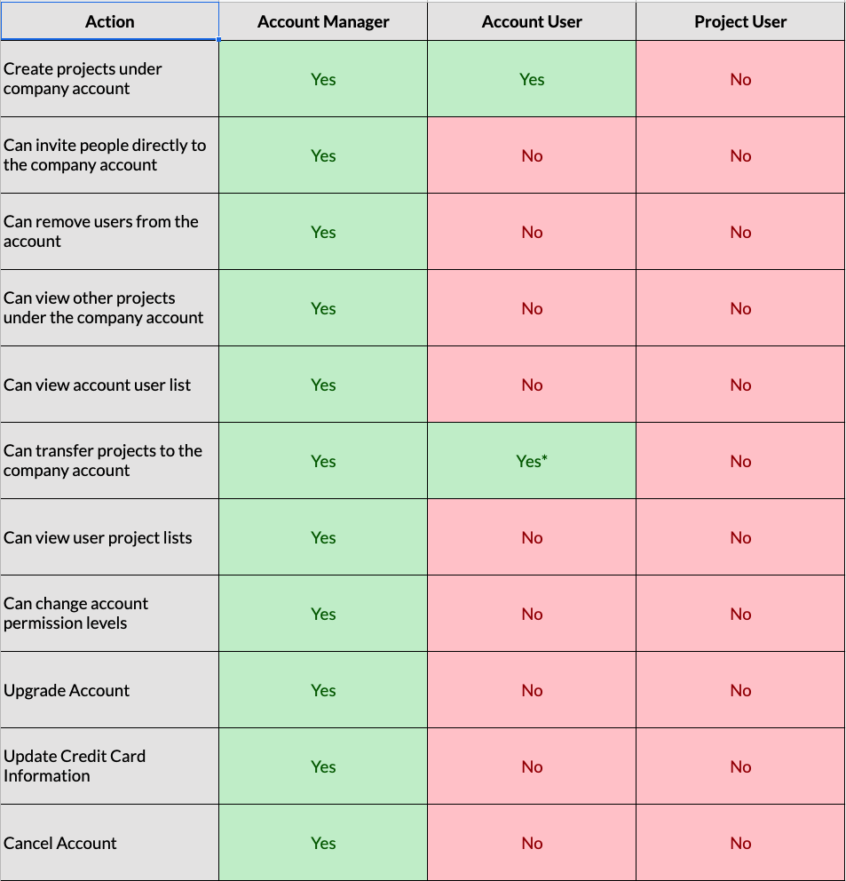 Account Managers can create, view, and edit all projects within an account and can invite new Account Managers and Account Users. (Account Owners have the same permissions as Account Managers.)