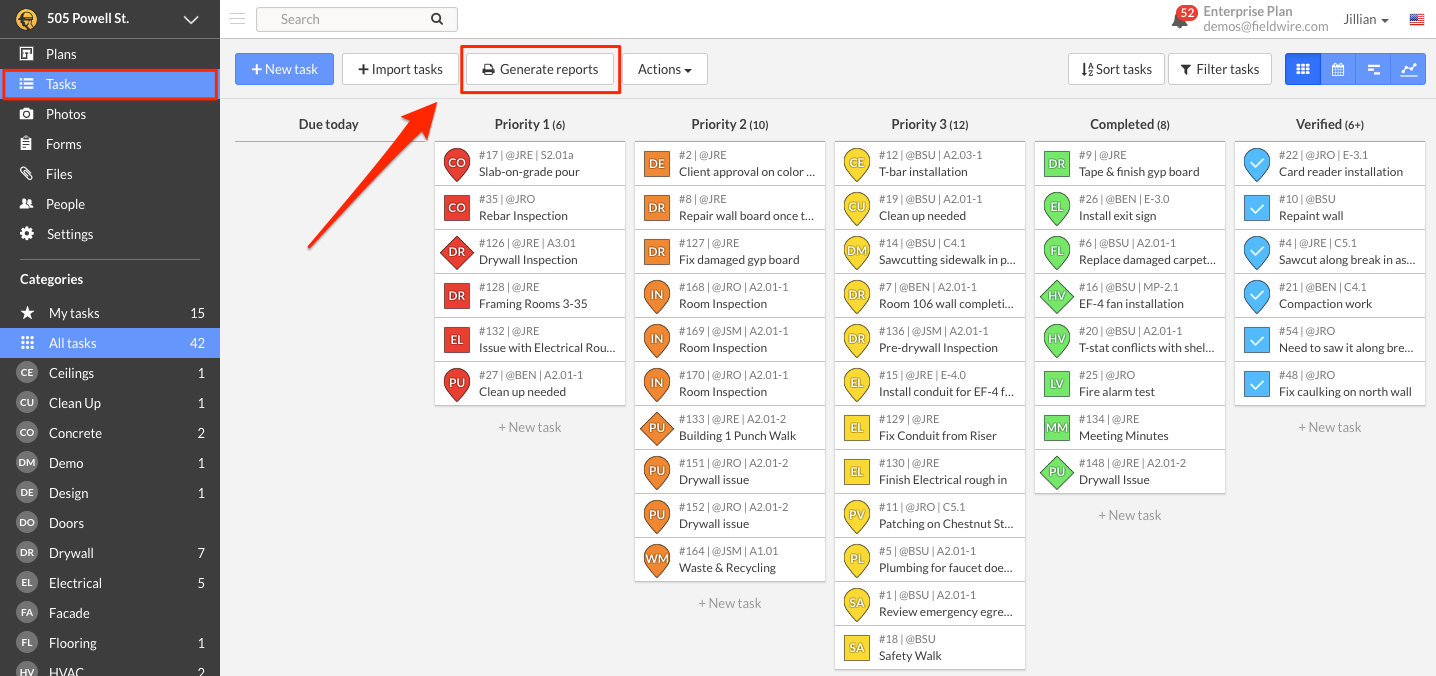 From the desktop view of Fieldwire’s task dashboard, easily generate a PDF or detailed report by clicking the "Generate report" tab.