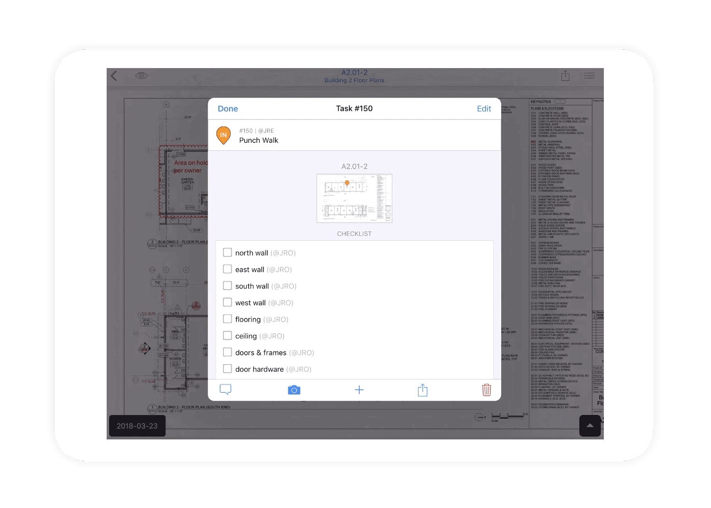 Tasks and checklist items can be assigned directly to the right person using the "@" symbol, along with a category, due date, priority level, and more. You can even add photos and messages to tasks to clearly communicate the defect and avoid any confusion. ipad-gif-1-final If you don’t have time to create a detailed task, use Fieldwire on mobile to quickly document punch items while walking around the jobsite. If you see an issue, just drop a pin onto the plan where you found it, even if you’re working offline — they will sync automatically once you have an internet connection again.