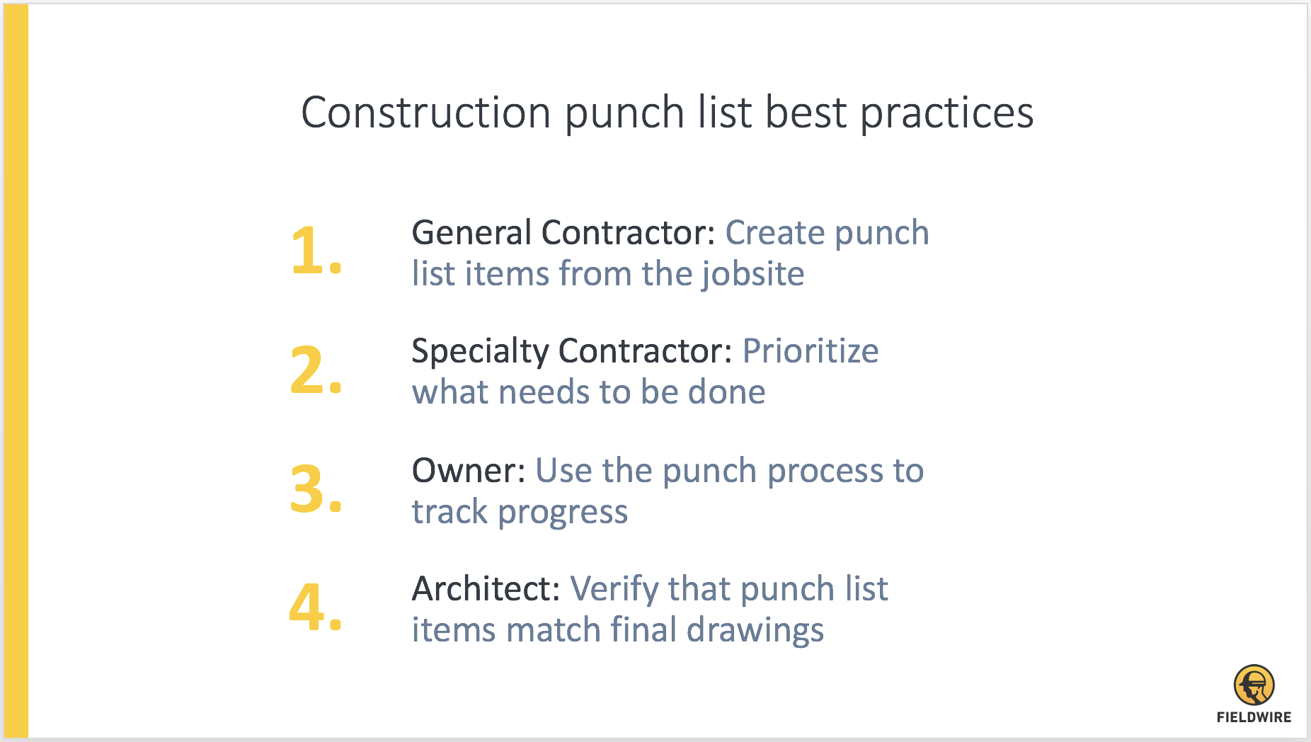 Creating and following a set of punch list best practices is critical for attaining zero punch-list status and finishing construction projects on-time. Punch list best practices — be it those outlined above or something you created on your own — also help with accurate walkthroughs, effortless reporting, and faster close out.