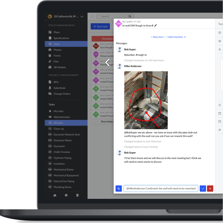 Field teams can easily update the office on installation progress, pick up where another foreman left off, and check off completed items.